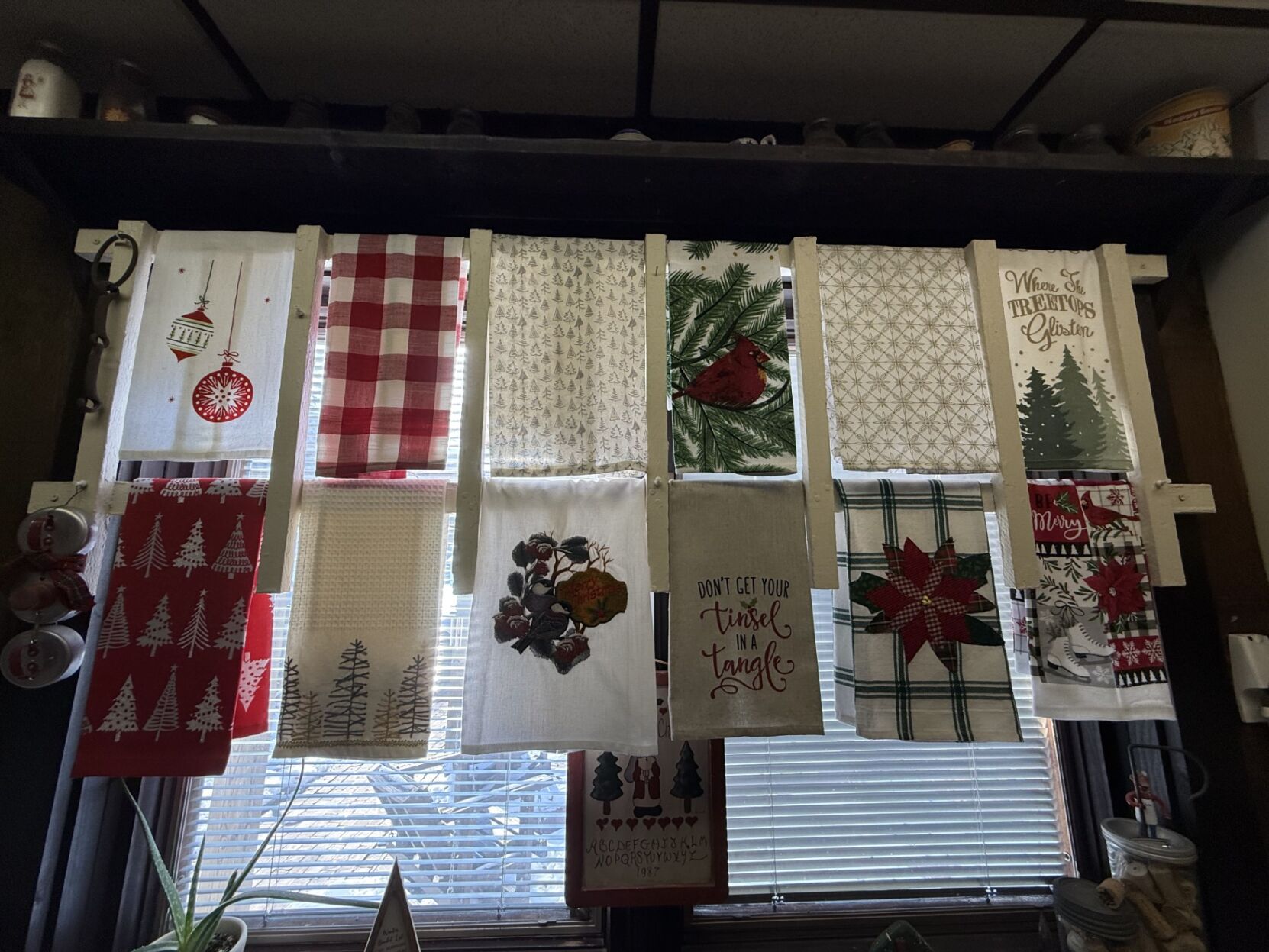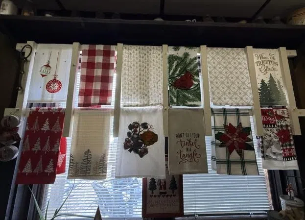 THE FOLLOWING IS A NEWS-GAZETTE STORY BY JENNIFER BAILEY ABOVE: Sue Owens of Danville displays some of her many dish and tea towels on a trellis over her kitchen sink. (Jennifer Bailey photos/T...