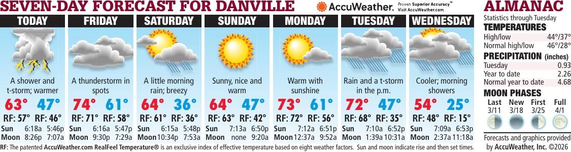 ![]() DANVILLE — District 118 Superintendent John Hart announced Friday morning that Danville High School would be in session after the district rec… WASHINGTON — President Donald Trump on Thursday fired his embattled Homeland Security Secretary Kristi Noem, after mounting criticism over her… DANVILLE — District 118 Superintendent John Hart announced Thursday night that a bomb threat was made on social media involving Danville High School. DANVILLE — A First Friday favorite returns this Friday at the Fischer Theatre. COVINGTON, Ind. — Members of the Covington City Council were brought to tears as Mayor Brad Crain honored Colton Wright, who died after being … WASHINGTON — Senate Republicans voted down an effort Wednesday to halt President Donald Trump’s war against Iran, demonstrating early support … In the calmest, commanding voice I could muster, I told the children to all gather in the basement at once. In no time, Julia had cleared the … WARREN COUNTY, Ind. — The Indiana Department of Transportation announces intermittent flagging operations that will impact State Road 28 just … DANVILLE — The Laura Lee Fellowship House in Danville is hosting a Get Out the Vote Youth Rally from 6 to 8 p.m. this Saturday. More NewsIn the calmest, commanding voice I could muster, I told the children to all gather in the ba… WARREN COUNTY, Ind. — The Indiana Department of Transportation announces intermittent flaggi… DANVILLE — The Laura Lee Fellowship House in Danville is hosting a Get Out the Vote Youth Ra… DUBAI, United Arab Emirates — A U.S. submarine sank an Iranian warship in the Indian Ocean, … DANVILLE — Improvements are coming to the Danville Rescue Mission, a homeless shelter for men. DUBAI, United Arab Emirates — Israel stepped up airstrikes on Iranian missile launchers and … WASHINGTON — Oil prices jumped Tuesday for the second straight day and gas prices moved high… Most PopularPhoto Galleries |