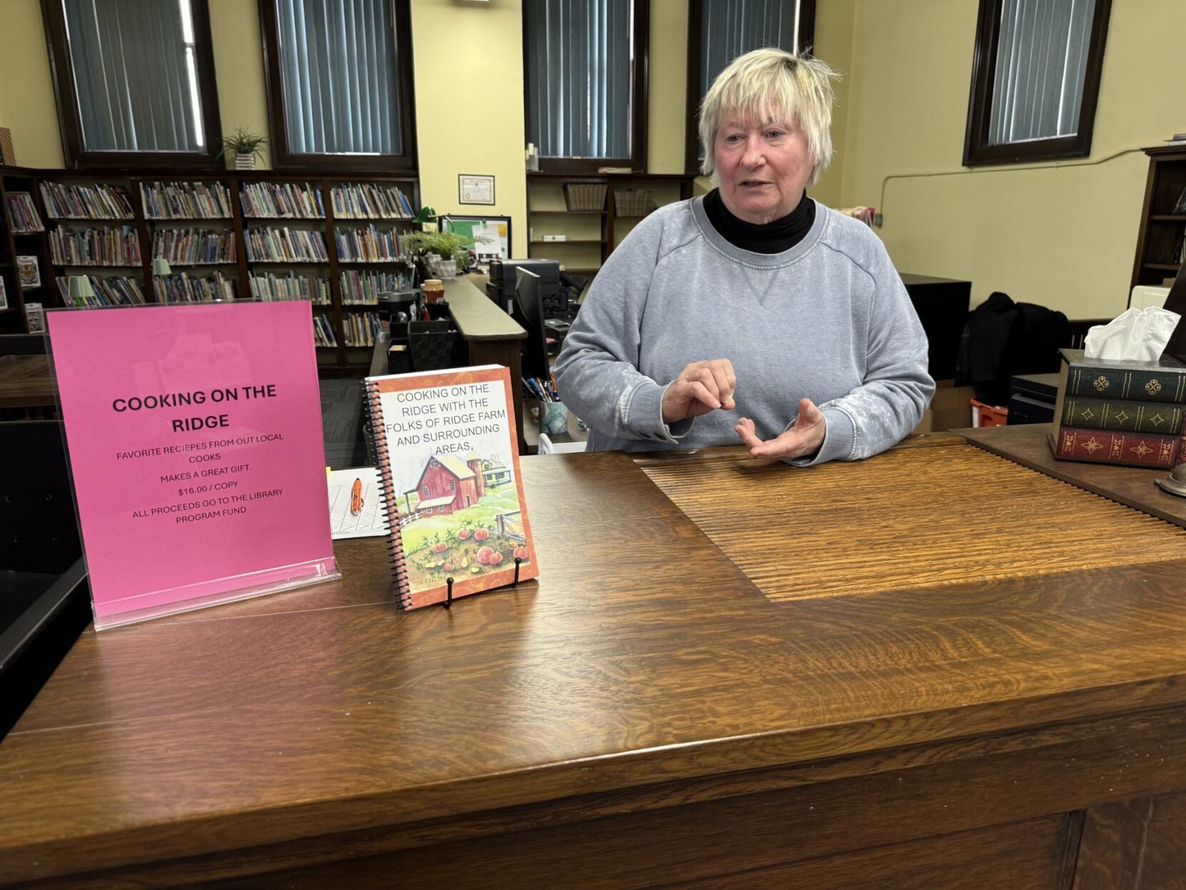 THE FOLLOWING IS A NEWS-GAZETTE STORY BY JENNIFER BAILEY ABOVE: Diane Dawson, treasurer of the Elwood District Carnegie Library, is shown at the restored front desk, at the library along Illino...